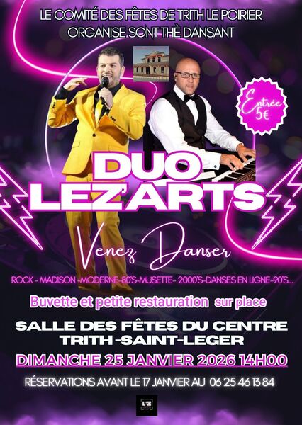 Date : Dimanche 25/01/2026 Horaires : 14h Tarifs : Entrée 5€ Organisateur : COMITÉ DES FÊTES DE TRITH-LE-POIRIER Adresse de l'événement : SALLE DES FÊTES DU CENTRE 59268 ABANCOURT Informations complémentaires : Animation : Duo Lez'Arts. Danses proposées : rock, madison, musette, variétés modernes, années 80, années 90, années 2000, danses en ligne. Buvette et petite restauration sur place. Réservations avant le 17 janvier 2026. Danses pratiquées : Danses de salon, Danses en ligne, Danses rétro, Disco en ligne, Madison, Rock Référence de l'annonce : 61074 call06 25 46 13 84
