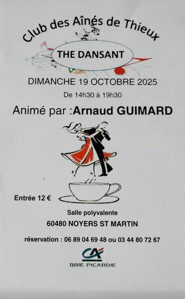 Date : Dimanche 19/10/2025 Horaires : 14h30 à 19h30 Tarifs : 12€ Organisateur : CLUB DES AÎNÉS DE THIEUX Adresse de l'événement : SALLE POLYVALENTE 60220 ABANCOURT Informations complémentaires : Animation : Arnaud Guimard. Danses pratiquées : Danses de salon, Danses en ligne, Danses rétro Référence de l'annonce : 53144 call06 89 04 69 48call03 44 80 72 67