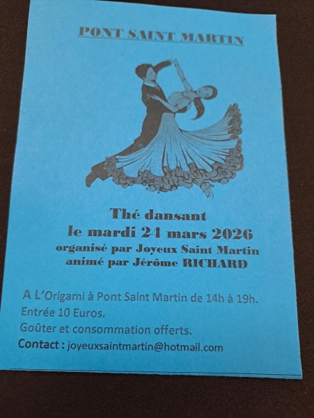 Date : Mardi 24/03/2026 Horaires : 14h à 19h Tarifs : 10€ Organisateur : JOYEUX SAINT-MARTIN Adresse de l'événement : L'ORIGAMI RUE DE LA MÔNE 44170 ABBARETZ Informations complémentaires : Animation : Orchestre Jérôme Richard. Boisson chaude et goûter offerts. Danses pratiquées : Danses de salon, Danses en ligne (Line dance), Danses rétro Référence de l'annonce : 64635 call06 69 52 84 18