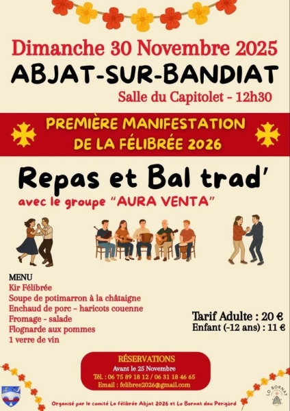 Date : Dimanche 30/11/2025 Horaires : 12h30 à 16h30 Tarifs : Adulte : 20€ Enfant (-12 ans) : 11€ Organisateur : COMITÉ DE LA FÉLIBRÉE ABJAT 2026 ET LO BORNAT DAU Adresse de l'événement : SALLE DU CAPITOLET 24300 ABJAT SUR BANDIAT Informations complémentaires : Animation : groupe Aura Venta. Repas convivial suivi d'un bal trad?. Menu : kir Félibrée, soupe de potimarron à la châtaigne, enchaud de porc-haricots couenne, fromage-salade, flognarde aux pommes, 1 verre de vin. Réservation avant le 25 novembre. Danses pratiquées : Danse folklorique Référence de l'annonce : 55957 call06 75 89 18 12call06 31 18 46 65