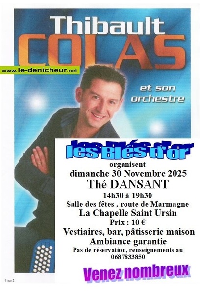 Date : Dimanche 30/11/2025 Horaires : 14h30 à 19h30 Tarifs : 10€ Organisateur : LES BLÉS D'OR Adresse de l'événement : SALLE DES FÊTES ROUTE DE MARMAGNE 18250 ACHERES Informations complémentaires : Animation : Thibault Colas et son orchestre. Vestiaires, bar et pâtisserie maison. Ambiance garantie. Pas de réservation. Danses pratiquées : Danses de salon, Danses en ligne, Danses rétro Référence de l'annonce : 52441 call06 87 83 38 50