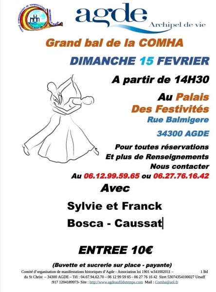 Date : Dimanche 15/02/2026 Horaires : 14h30 à 18h30 Tarifs : 10€ Organisateur : COMITÉ D'ORGANISATION DE MANIFESTATIONS HISTORIQUE Adresse de l'événement : PALAIS DES FESTIVITÉS RUE BALMIGÈRE 34300 AGDE Informations complémentaires : Animation : Sylvie et Franck Bosca-Caussat. Danses de salon. Nouvelle salle avec grande piste de danse. Ambiance et bonne humeur. Réservation possible. Buvette et sucrerie payantes. Danses pratiquées : Danses de salon, Danses en ligne (Line dance), Danses rétro Référence de l'annonce : 62583 call04 67 94 62 70call06 12 99 59 65