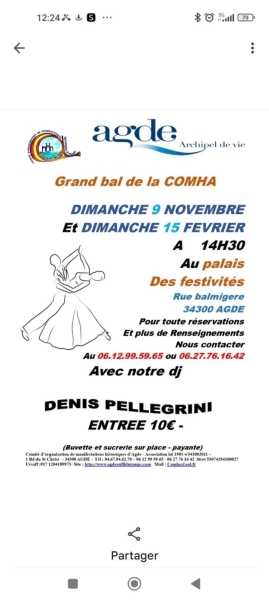Dates : Dimanche 09/11/2025, Dimanche 15/02/2026 Horaires : 14h30 à 18h30 Tarifs : 10€ Organisateur : COMHA Adresse de l'événement : PALAIS DES FESTIVITÉS RUE BALMIGÈRE 34300 AGDE Informations complémentaires : Animation : DJ Denis Pellegrini