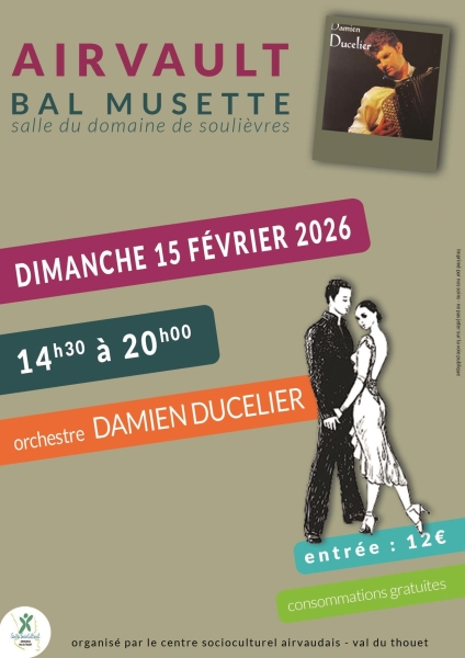 Date : Dimanche 15/02/2026 Horaires : 14h30 à 20h Tarifs : 12€ Organisateur : CENTRE SOCIO CULTUREL DE L'AIRVAUDAIS ET DU VAL DU Adresse de l'événement : SALLE DU DOMAINE DE SOULIÈVRES 79600 AIRVAULT Informations complémentaires : Animation : Orchestre Damien Ducelier. Consommations gratuites. Danses pratiquées : Danses de salon, Danses en ligne (Line dance), Danses rétro Référence de l'annonce : 62582 call05 49 64 73 10