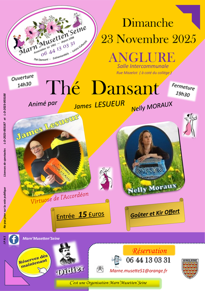 Date : Dimanche 23/11/2025 Horaires : 14h30 à 19h30 Tarifs : 15 £uros goûter et Kir offert Organisateur : MARN'MUSETTEN'SEINE Adresse de l'événement : SALLE INTERCOMMUNALE - RUE MAZELOT À COTÉ DU COLLÈGE 51260 ANGLURE Informations complémentaires : Venez passer un bel Après-midi autour de la danse et de la musique animé par le virtuose de l'accordéon " James LESUEUR et Nelly Moraux " IL est recommandé de réserver. Danses pratiquées : Bachata, Boléro, Boston, Cha cha cha, Charleston, Cumbia, Danses de salon, Java Référence de l'annonce : 53998 call06 44 13 03 31