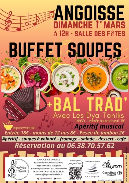 Date : Dimanche 01/03/2026 Horaires : 12h Tarifs : 18€, moins de 12 ans 8€, entrée bal trad seul 8€ Organisateur : LA PUCE À L'OREILLE Adresse de l'événement : SALLE DES FÊTES 24270 ANGOISSE Informations complémentaires : Animation : Les Dya-Toniks. Apéritif musical. Pesée de jambon 2€. Souper : apéritif, soupes à volonté, fromage, salade, dessert-café. Apportez votre bol. Réservation conseillée. Événement organisé avec le soutien du Département de la Dordogne et Carrefour Contact Jumilhac-le-Grand. Danses pratiquées : Danse folklorique Référence de l'annonce : 64387 call06 38 70 57 62