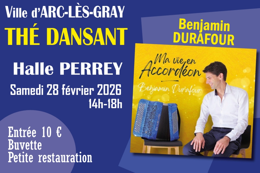 Date : Samedi 28/02/2026 Horaires : 14h à 18h Tarifs : 10€ Organisateur : MAIRIE ARC-LÈS-GRAY Adresse de l'événement : HALLE PERREY RUE LOUIS-CHAUVEAU 70100 ARC LES GRAY Informations complémentaires : Animation : Benjamin Durafour, accordéoniste. Danses : valse, tango, paso, marche, danse en ligne, etc. Buvette et petite restauration. Danses pratiquées : Danses de salon, Danses en ligne (Line dance), Danses rétro, Tango Référence de l'annonce : 63772 call03 84 65 14 14