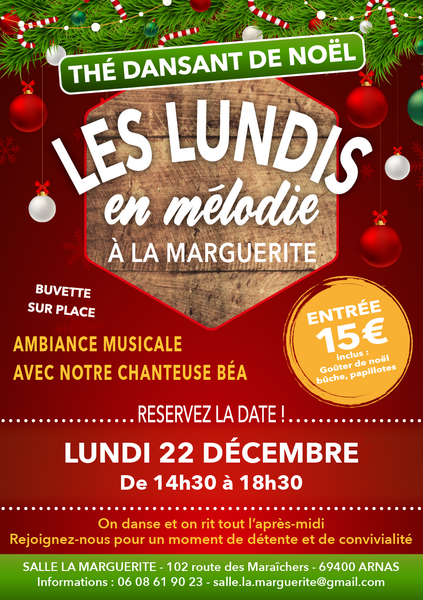 Date : Lundi 22/12/2025 Horaires : 14h30 à 18h30 Tarifs : 15€ avec gouter de noêl Organisateur : SALLE DE RÉCEPTION LA MARGUERITE Adresse de l'événement : 101 ROUTE DES MARAICHERS 69400 ARNAS Informations complémentaires : C'est le dernier rendez-vous de l'année pour nos traditionnels lundis en mélodie…