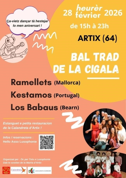 15h-17h : Atelier de danses de Mallorca (préparation du bal) 17h : Bal trad béarnais animé par Los Babaus 18h : Bal trad portugais animé par Kestamos 20h30 : Bal trad de Mallorca (ball de bot) animé par Ramellets 22h : Bœuf musical ouvert à tous Petite restauration et buvette proposées par la Calandreta d'Artix Soutien de la mairie d'Artix Fête de la quarantaine d'une cigale béarnaise Danses pratiquées : Danse folklorique Référence de l'annonce : 58405