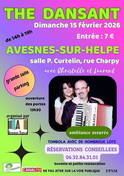 Date : Dimanche 15/02/2026 Horaires : de 14h00 à 19h00 Tarifs : 7 euros l'entrée Organisateur : AVESNES DANCE Adresse de l'événement : RUE CHARPY 59440 AVESNES SUR HELPE Informations complémentaires : THÉ DANSANT de l'association AVESNES DANCE le dimanche15 février 2026, de 14h à 19h, ouverture des portes à 13h30, à AVESNES-SUR-HELPE, salle Paul Curtelin rue Charpy, avec l'orchestre Christelle et Laurent, ambiance assurée
