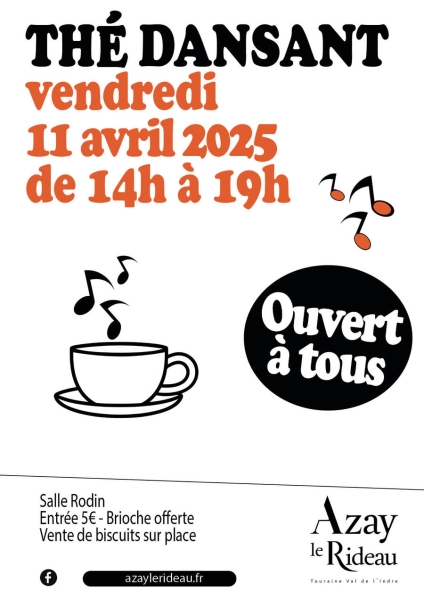 Date : Jeudi 20/11/2025 Horaires : 14h à 19h Tarifs : Entrée 5€ Organisateur : CCAS D?AZAY-LE-RIDEAU Adresse de l'événement : SALLE RODIN RUE GUSTAVE EIFFEL 37190 AZAY LE RIDEAU Informations complémentaires : Brioche offerte. Vente de biscuits sur place. Ouvert à tous. Sans réservation. Danses pratiquées : Danses de salon, Danses en ligne, Danses rétro Référence de l'annonce : 52410 call02 47 45 42 11