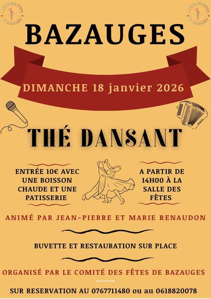 Date : Dimanche 18/01/2026 Horaires : 14h Tarifs : Entrée 10€ avec une boisson chaude et une pâtisserie Organisateur : COMITÉ DES FÊTES DE BAZAUGES Adresse de l'événement : SALLE DES FÊTES 17490 BAZAUGES Informations complémentaires : Animation : Jean-Pierre et Marie Renaudon. Buvette et restauration sur place. Danses pratiquées : Danses de salon, Danses en ligne, Danses rétro Référence de l'annonce : 61191 call07 67 71 14 80call06 18 82 00 78