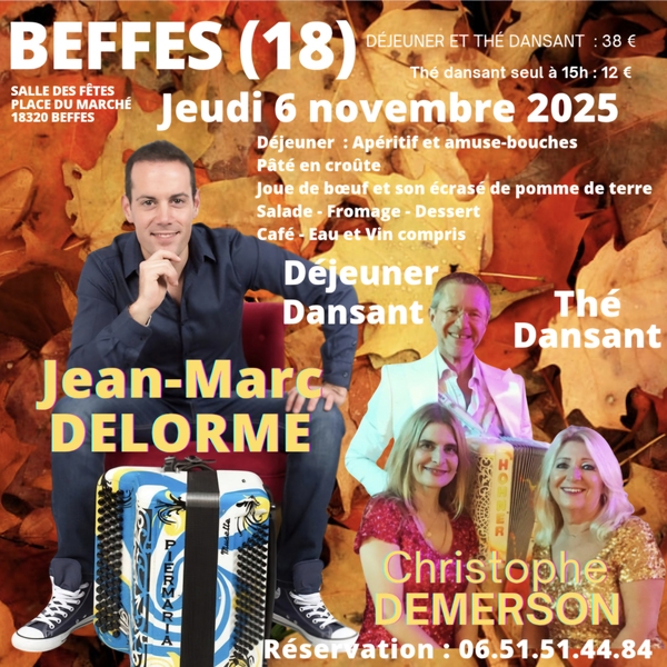 Date : 06/11/2025 (Événement passé) Horaires : 12h ou 15h Tarifs : 12€ ou 38€ Organisateur : FAN-CLUB Adresse de l'événement : SALLE DES FÊTES PLACE DU MARCHÉ 18320 BEFFES Informations complémentaires : Déjeuner dansant et thé dansant animé par Jean Marc Delorme et Christophe Demerson Danses pratiquées : Danses de salon, Danses rétro Référence de l'annonce : 53362 call06 51 51 44 84