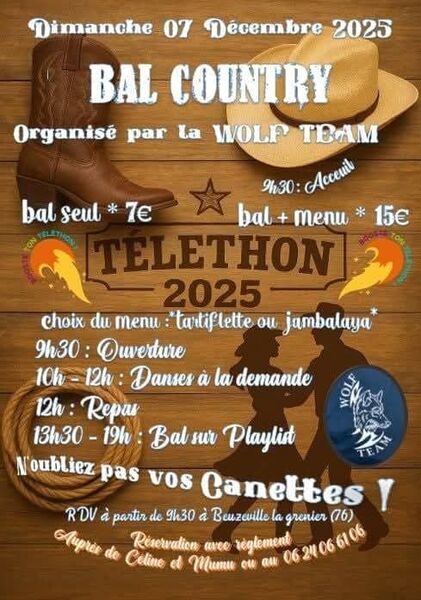 Date : Dimanche 07/12/2025 Horaires : 9h30-19h Tarifs : Bal seul 7€ / Bal + menu 15€ Organisateur : LA WOLF TEAM Adresse de l'événement : LE GRENIER 76210 BEUZEVILLE LA GRENIER Informations complémentaires : Au profit du Téléthon. Menu au choix : tartiflette ou jambalaya. Collecte solidaire de canettes. Réservation avec règlement obligatoire. Danses pratiquées : Country Référence de l'annonce : 53983 call06 21 06 61 06call06 24 06 01 06