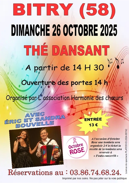 Date : Dimanche 26/10/2025 Horaires : 14h30 Tarifs : 13€ Organisateur : ASSOCIATION HARMONIE DES CHOEURS Adresse de l'événement : 58310 BITRY Informations complémentaires : Animation : Éric et Sandra Bouvelle et orchestre Jean-Marc Hérouart. Ouverture des portes à 14h. À l?occasion d?Octobre Rose, tombola au profit de "Foutu cancer 58" (ticket 2€). Danses pratiquées : Danses de salon, Danses en ligne, Danses rétro Référence de l'annonce : 52653 call03 86 74 68 24