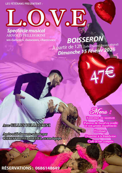 Date : Dimanche 15/02/2026 Horaires : 12h Tarifs : 47€ Organisateur : LES FÉTÉRANS Adresse de l'événement : SALLE CHABROL - ESPACE MISTRAL 34160 BOISSERON Informations complémentaires : Animation : Spectacle musical L.O.V.E avec Arnold Pellegrini, ses danseurs, danseuses et chanteuses, et avec Gilles Pellegrini. Après-midi dansante animée par Christophe Michel et son équipe. Menu : entremet de saumon, paleron de bœuf confit et gratin dauphinois, fromage, douceur à la framboise, café et vin compris. Danses pratiquées : Danses de salon, Danses en ligne (Line dance), Danses rétro Référence de l'annonce : 62115 call06 86 14 86 49