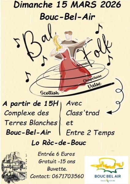 Date : Dimanche 15/03/2026 Horaires : 15h à 19h Tarifs : 6€ (gratuit -15 ans) Organisateur : LO RÒC-DE-BOUC Adresse de l'événement : COMPLEXE TERRE BLANCHE 36 CHEMIN DE TERRE BLANCHE 13320 BOUC BEL AIR Informations complémentaires : Animation : Class?trad et Entre 2 Temps. Danses : scottish, chapeloise, valse, bourrée. Buvette. Danses pratiquées : Danse folklorique Référence de l'annonce : 64525 call06 71 70 35 60