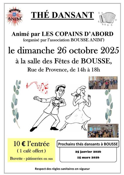 Dates : Dimanche 26/10/2025, Dimanche 25/01/2026, Dimanche 15/03/2026 Horaires : 14h à 18h Tarifs : 10€ (1 café offert) Organisateur : ASSOCIATION BOUSSE ANIM' Adresse de l'événement : SALLE DES FÊTES RUE DE PROVENCE 57310 BOUSSE Informations complémentaires : Animation : Les Copains d'Abord. Buvette et pâtisseries sur place. Respect des règles sanitaires en vigueur. Danses pratiquées : Danses de salon, Danses en ligne, Danses rétro Référence de l'annonce : 53281