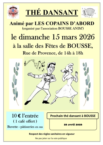 15/03/2026 : Animation "Les Copains d'Abord" 26/04/2026 : Animation "Les Copains d'Abord" 1 café offert. Ouverture de la salle vers 13h30. Vente de boissons et de pâtisseries en salle. Réservation souhaitée pour les groupes supérieurs à 10 personnes. Non conseillé aux enfants. Respect des règles sanitaires en vigueur. Danses pratiquées : Danses de salon, Danses en ligne (Line dance), Danses rétro Référence de l'annonce : 64503 call07 88 04 79 67