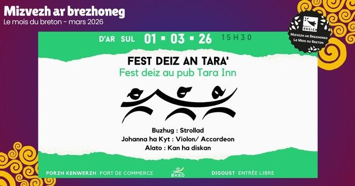 Date : Dimanche 01/03/2026 Horaires : 15h30 à 18h30 Tarifs : Gratuit Organisateur : TARA INN Adresse de l'événement : TARA INN 1 RUE BLAVEAU 29200 BREST Informations complémentaires : Animation : Buzhug (Strollad), Johanna ha Kyt (violon / accordéon), Alato (kan ha diskan). Port de commerce. Entrée libre dans le cadre du mois du breton (Mizvezh ar brezhoneg). Danses pratiquées : Danse bretonne Référence de l'annonce : 63789