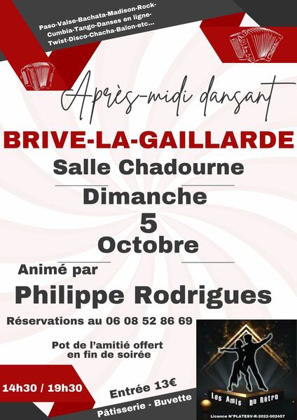 Date : Dimanche 05/10/2025 Horaires : 14h30-19h30 Tarifs : 13€ Organisateur : LES AMIS DU RÉTRO Adresse de l'événement : SALLE CHADOURNE 19100 BRIVE LA GAILLARDE Informations complémentaires : Animation : Philippe Rodrigues et Orchestre Jacky Bruel. Danses : Paso, valse, bachata, madison, rock, cumbia, tango, danse en ligne, twist, disco, chacha, baïon, etc. Pot de l'amitié offert en fin de soirée. Pâtisserie et buvette. Danses pratiquées : Bachata, Danses de salon, Danses en ligne, Danses rétro, Disco en ligne, Madison, Rock, Tango, Twist, Valse Référence de l'annonce : 51837 call06 08 52 86 69