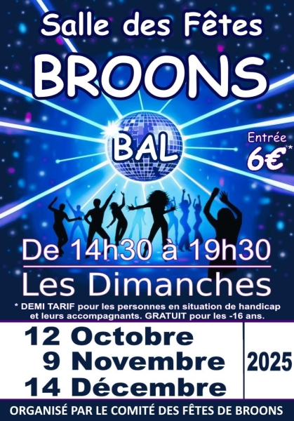 Dates : Dimanche 09/11/2025, Dimanche 14/12/2025 Horaires : 14h30 à 19h30 Tarifs : 6€ Demi-tarif pour les personnes en situation de handicap et leurs accompagnants. Gratuit pour Organisateur : COMITÉ DES FÊTES DE BROONS Adresse de l'événement : SALLE DES FÊTES 7 RUE DE PLUMAUGAT 22250 BROONS Informations complémentaires : Animation : Star's Music. Ouvert à tous. Un dimanche par mois. Salle des fêtes de Broons. Danses pratiquées : Disco en ligne Référence de l'annonce : 53849