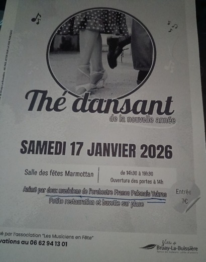 Date : Samedi 17/01/2026 Horaires : de 14h30 à 19h30 Tarifs : 7€ Organisateur : LES MUSICIENS EN FÊTE Adresse de l'événement : SALLE DES FÊTES MARMOTTAN 62700 BRUAY LA BUISSIERE Informations complémentaires : Animation : Orchestre Franco Polonais Yskras. Ouverture des portes à 14h. Petite restauration et buvette sur place. Danses pratiquées : Danses de salon, Danses en ligne, Danses rétro Référence de l'annonce : 61068 call06 62 94 13 01
