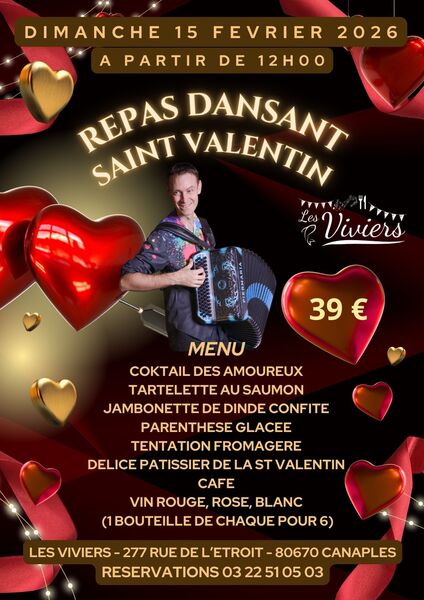 Date : Dimanche 15/02/2026 Horaires : 12h Tarifs : 39€ Organisateur : LES VIVIERS Adresse de l'événement : LES VIVIERS 277 RUE DE L'ÉTROIT 80670 CANAPLES Informations complémentaires : Animation : Orchestre Cédric Depret. Saint-Valentin. Menu : cocktail des amoureux, tartelette au saumon, jambonnette de dinde confite, parenthèse glacée, tentation fromagère, délice pâtissier de la Saint-Valentin, café. Vin rouge, rosé, blanc (1 bouteille de chaque pour 6 personnes). Danses pratiquées : Danses de salon, Danses en ligne (Line dance), Danses rétro Référence de l'annonce : 61983 call03 22 51 05 03