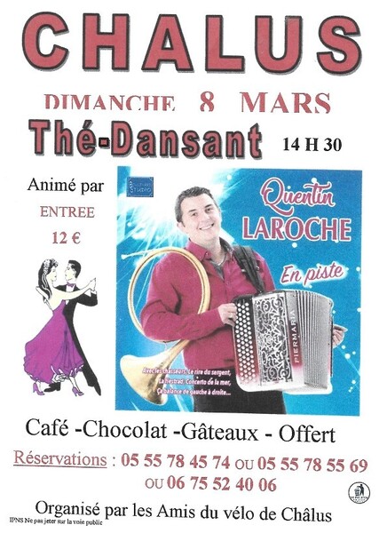 Date : Dimanche 08/03/2026 Horaires : 14h30 Tarifs : 12€ Organisateur : LES AMIS DU VÉLO DE CHÂLUS Adresse de l'événement : SALLE POLYVALENTE PLACE SALVADOR ALLENDE 87230 CHALUS Informations complémentaires : Animation : Quentin Laroche et son orchestre. Café, chocolat et gâteaux offerts. Danses pratiquées : Danses de salon, Danses en ligne (Line dance), Danses rétro Référence de l'annonce : 64228 call05 55 78 45 74call05 55 78 55 69