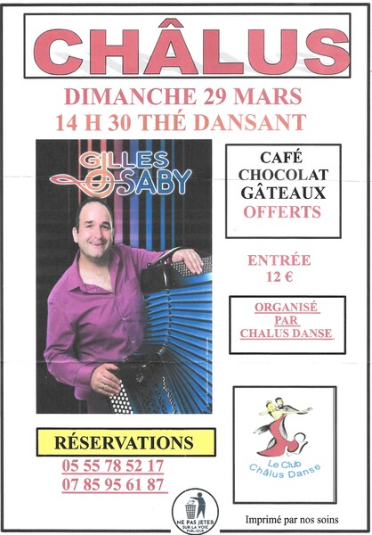 Date : Dimanche 29/03/2026 Horaires : 14h30 Tarifs : 12€ Organisateur : ASS CHÂLUS DANSE Adresse de l'événement : SALLE POLYVALENTE LOUIS ARAGON PLACE SALVADOR ALLENDE 87230 CHALUS Informations complémentaires : Animation : Gilles Saby et son orchestre. Café, chocolat et gâteaux offerts. Danses pratiquées : Danses de salon, Danses en ligne (Line dance), Danses rétro Référence de l'annonce : 64246 call05 55 78 52 17call07 85 95 61 87