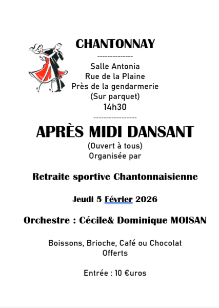 Date : Jeudi 05/02/2026 Horaires : 14h30 Tarifs : 10€uros Organisateur : RETRAITE SPORTIVE CHANTONNAISIENNE Adresse de l'événement : SALLE ANTONIA RUE DE LA PLAINE 85110 CHANTONNAY Informations complémentaires : La retraite sportive chantonnasienne, organise un après-midi dansant.