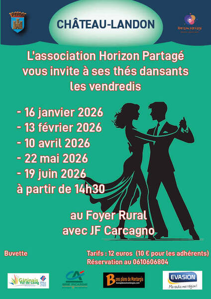 Date : Vendredi 13/02/2026 Horaires : à partir de 14h30 Tarifs : 12 euros ( 10 euros adhérents à l'association) Organisateur : ASSOCIATION HORIZON PARTAGÉ Adresse de l'événement : FOYER RURAL, BOULEVARD CARNOT 77570 CHATEAU LANDON Danses pratiquées : Bachata, Boléro, Cha cha cha, Charleston, Danses de salon, Danses en ligne, Quickstep, Rock, Valse Référence de l'annonce : 58992 call06 10 60 68 04call06 59 18 62 83