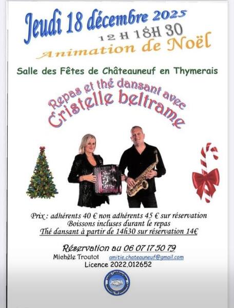Date : 18/12/2025 (Événement passé) Horaires : 12h à 18h30 Tarifs : Repas 40€ (adhérents) / 45€ (non-adhérents) ; Thé dansant seul 14€ Organisateur : MICHÈLE TROUTOT Adresse de l'événement : SALLE DES FÊTES 28170 CHATEAUNEUF EN THYMERAIS Informations complémentaires : Animation : Orchestre Cristelle Beltrame. Boissons incluses durant le repas. Animation de Noël. Réservation obligatoire. Danses pratiquées : Danses de salon, Danses en ligne, Danses rétro Référence de l'annonce : 57940 call06 07 17 50 79