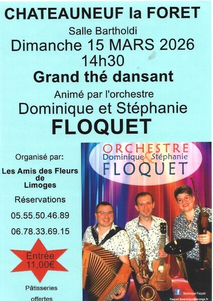 Date : Dimanche 15/03/2026 Horaires : 14h30 Tarifs : 11€ Organisateur : LES AMIS DES FLEURS DE LIMOGES Adresse de l'événement : SALLE BARTHOLDI 25 AVENUE MICHEL SINIBALDI 87130 CHATEAUNEUF LA FORET Informations complémentaires : Animation : Orchestre Dominique et Stéphanie Floquet. Pâtisseries offertes. Danses pratiquées : Danses de salon, Danses en ligne (Line dance), Danses rétro Référence de l'annonce : 64245 call05 55 50 46 89call06 78 33 69 15