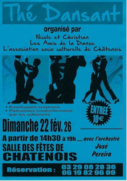 Date : Dimanche 22/02/2026 Horaires : 14h30 à 19h Tarifs : 10€ Organisateur : FOYER D'ANIMATION DE CHÂTENOIS Adresse de l'événement : SALLE DES FÊTES PLACE DU CHAMP-DE-FOIRE 88170 CHATENOIS Informations complémentaires : Animation : Orchestre José Pereira. Enveloppes surprises. Buvette. Pâtisseries confectionnées par les adhérents. Accès adapté aux personnes à mobilité réduite. Danses pratiquées : Danses de salon, Danses en ligne (Line dance), Danses rétro Référence de l'annonce : 62696 call03 29 94 59 58call03 29 08 28 36