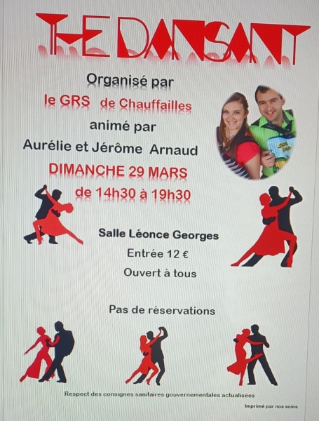 Date : Dimanche 29/03/2026 Horaires : 14h30 à 19h30 Tarifs : 12€ Organisateur : GRS CHAUFFAILLES Adresse de l'événement : SALLE LÉON GEORGES 2 TER RUE GAMBETTA 71170 CHAUFFAILLES Informations complémentaires : Animation : Aurélie et Jérôme Arnaud. Répertoire inspiré de la variété et de tous les rythmes pour danses de couple et en ligne. Sourires obligatoires et chaussures de danse conseillées. Accès adapté aux personnes à mobilité réduite. Ouvert à tous. Pas de réservations. Respect des consignes sanitaires gouvernementales actualisées. Danses pratiquées : Danses de salon, Danses en ligne (Line dance), Danses rétro, Variété Référence de l'annonce : 64171 call06 11 60 24 90