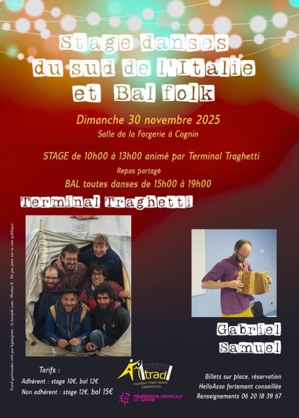 Date : Dimanche 30/11/2025 Horaires : 10h à 19h Tarifs : Stage : 12€ (non adhérent), 10€ (adhérent). Bal : 15€ (non adhérent), 12&eu Organisateur : AMTRAD Adresse de l'événement : SALLE DE LA FORGERIE AVENUE DE CORINTHE 73160 COGNIN Informations complémentaires : Animation : Terminal Traghetti et Gabriel Samuel. Danses du sud de l'Italie : pizzica, tammurriata. Repas partagé. Billets sur place. Réservation recommandée sur HelloAsso.