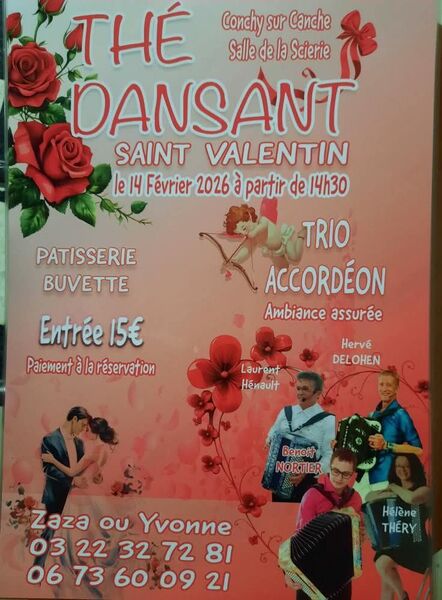 Date : Samedi 14/02/2026 Horaires : 14h30 Tarifs : 15€ Adresse de l'événement : SALLE DE LA SCIERIE 62270 CONCHY SUR CANCHE Informations complémentaires : Animation : Orchestre Laurent Hénault. Saint-Valentin. Pâtisserie. Buvette. Paiement à la réservation. Trio accordéon. Ambiance assurée. Danses pratiquées : Danses de salon, Danses en ligne, Danses rétro Référence de l'annonce : 56416 call03 22 32 72 81call06 73 60 09 21