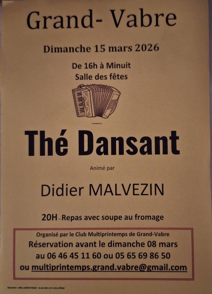 Date : Dimanche 15/03/2026 Horaires : 16h à minuit Organisateur : CLUB MULTIPRINTEMPS DE GRAND-VABRE Adresse de l'événement : SALLE DES FÊTES 12320 CONQUES EN ROUERGUE Informations complémentaires : Animation : Didier Malvezin. Repas avec soupe au fromage à 20h. Réservation avant le dimanche 8 mars. Danses pratiquées : Danses de salon, Danses en ligne (Line dance), Danses rétro Référence de l'annonce : 65157 call06 46 45 11 60call05 65 69 86 50