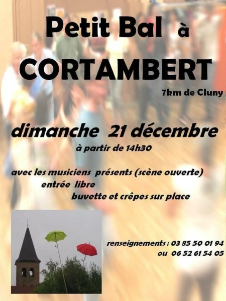 Date : Dimanche 21/12/2025 Horaires : 14h30 à 18h30 Tarifs : Participation libre au chapeau Organisateur : FOYER RURAL DE CORTAMBERT Adresse de l'événement : SALLE DU FOYER RURAL 11 D117 71250 CORTAMBERT Informations complémentaires : Animation : musiciens amateurs ou professionnels, scène ouverte. Répertoire traditionnel. Répétition le matin à partir de 10h pour les musiciens, repas tiré du sac. Crêpes et buvette sur place. Danses pratiquées : Danse folklorique Référence de l'annonce : 56798 call03 85 50 01 94call06 52 61 54 05