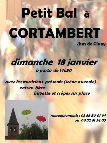 Date : Dimanche 18/01/2026 Horaires : 14h30 à 18h30 Tarifs : Participation libre au chapeau Organisateur : FOYER RURAL DE CORTAMBERT Adresse de l'événement : SALLE DU FOYER RURAL 11 D117 71250 CORTAMBERT Informations complémentaires : Animation : musiciens amateurs et professionnels tirant du répertoire traditionnel. Répétition possible à partir de 10h pour les musiciens. Repas tiré du sac à midi. Crêpes et buvette sur place. Scène ouverte. Danses pratiquées : Danse folklorique Référence de l'annonce : 57485 call03 85 50 01 94call06 52 61 54 05