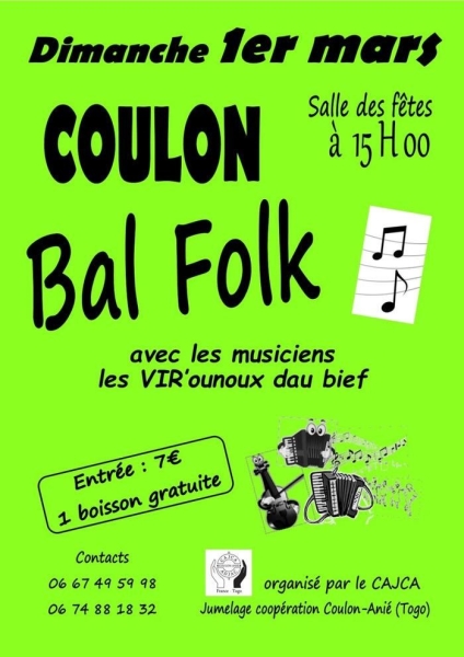 Date : Dimanche 01/03/2026 Horaires : 15h à 19h Tarifs : 7€, 1 boisson gratuite Organisateur : CAJCA Adresse de l'événement : SALLE DES FÊTES 31 RUE GABRIEL AUCHIER 79510 COULON Informations complémentaires : Animation : Les Virounoux d'au Bief de Saint-Symphorien. Jumelage coopération Coulon-Anié (Togo). Danses pratiquées : Danse folklorique Référence de l'annonce : 62789 call06 67 49 59 98call06 74 88 18 32