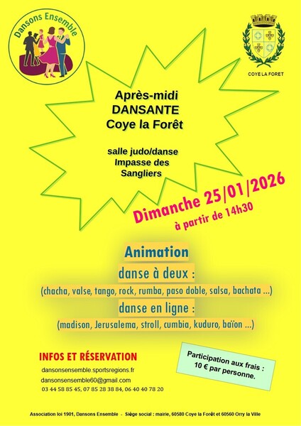 Date : Dimanche 25/01/2026 Horaires : 14h30 Tarifs : 10.00€ Organisateur : DANSONS ENSEMBLE Adresse de l'événement : IMPASSE DES SANGLIERS 60580 COYE LA FORET Danses pratiquées : Bachata, Danses de salon, Danses en ligne Référence de l'annonce : 57992 call07 85 28 38 84call06 40 40 78 20