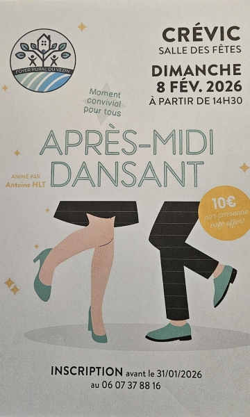 Date : 08/02/2026 (Événement passé) Horaires : 14h30 Tarifs : 10€ Organisateur : FOYER RURAL DU VEZIN Adresse de l'événement : SALLE DES FÊTES 2 RUE GAMBETTA 54110 CREVIC Informations complémentaires : Animation : Antoine HLT. Musicien et danseurs amateurs. Café et gâteau offerts. Accès adapté aux personnes à mobilité réduite. Inscription avant le 31/01/2026. Danses pratiquées : Danses de salon, Danses en ligne (Line dance), Danses rétro Référence de l'annonce : 62474 call06 07 37 88 16