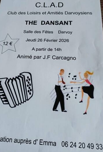 Date : Jeudi 26/02/2026 Horaires : 14h Tarifs : 12€ par personne Organisateur : C.L.A.D (CLUB DES LOISIRS ET AMITIÉS DARVOYSIENS) Adresse de l'événement : SALLE DES FÊTES 45150 DARVOY Informations complémentaires : Animation : Orchestre Jean-François Carcagno. Danses : valse, tango, paso et danses en ligne. Ambiance conviviale tous niveaux. Danses pratiquées : Danses de salon, Danses en ligne (Line dance), Danses rétro, Tango, Valse Référence de l'annonce : 63293 call06 24 20 49 33