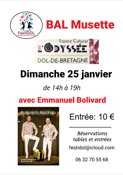 Date : Dimanche 25/01/2026 Horaires : 14h-19h Tarifs : 10€ Organisateur : ASSOCUATION FESTIDOL Adresse de l'événement : SALLE DU CENTRE CULTUREL ODYSSÉE ESPLANADE DE LA VILLE NICAULT 35120 DOL DE BRETAGNE Informations complémentaires : Réservation de table possible Danses pratiquées : Be-bop, Boléro, Cha cha cha, Charleston, Country, Danse bretonne, Danses de salon, Danses en ligne, Danses rétro, Java, Madison, Paso-doble, Polka, Rock, Salsa, Slowfox, Tango, Twist, Valse Référence de l'annonce : 51390 call06 32 70 55 68