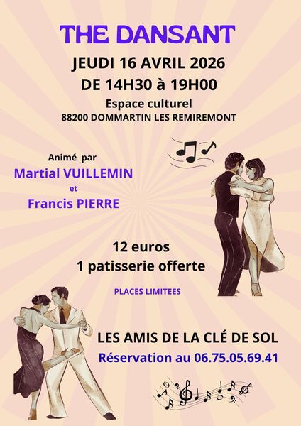 Date : Jeudi 16/04/2026 Horaires : 14h30-19h Tarifs : 12€ (1 pâtisserie offerte) Organisateur : LES AMIS DE LA CLÉ DE SOL Adresse de l'événement : ESPACE CULTUREL 88200 DOMMARTIN LES REMIREMONT Informations complémentaires : Animation : Martial Vuillemin et Francis Pierre. Places limitées. Danses pratiquées : Danses de salon, Danses en ligne (Line dance), Danses rétro Référence de l'annonce : 65944 call06 75 05 69 41