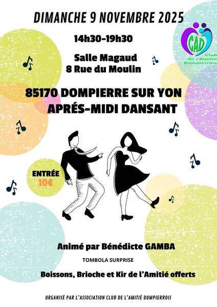 De 14h30 à 19h30, après-midi dansant ouvert à tous, organisé par le Club de l'Amitié Dompierrois et animé par l'orchestre Bénédicte GAMBA et Jérome. Danses de salon et danses en lignes… Ambiance festive !... Tombola surprise à la pause conviviale vers 17 heures. Boissons, Brioche et Kir de l'amitié offerts ! Entrée 10€. Danses pratiquées : Danses de salon, Danses en ligne Référence de l'annonce : 53966 call06 70 94 15 40