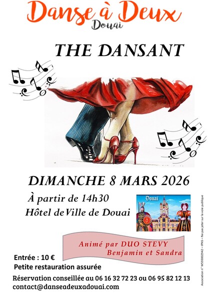 Date : Dimanche 08/03/2026 Horaires : 14h30 - 20h00 Tarifs : 10€ Organisateur : DANSE À DEUX À DOUAI Adresse de l'événement : 83 RUE DE LA MAIRIE SALLE DES FÊTES DE L'HÔTEL DE VILLE 59500 DOUAI Informations complémentaires : L'association Danse à Deux à DOUAI organise un thé dansant le Dimanche 8 Mars 2026 à partir de 14 heures 30 à la salle des fêtes de l'Hôtel de Ville de DOUAI, superbe salle avec un parquet idéal pour les danseurs.