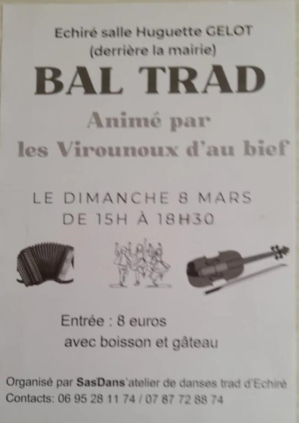 Date : Dimanche 08/03/2026 Horaires : 15h à 18h30 Tarifs : 8€ avec boisson et gâteau Organisateur : ASSOCIATION SASDANS?ATELIER DE DANSES TRAD D?ÉCHIR Adresse de l'événement : SALLE HUGUETTE GELOT 10 PLACE DES POMPES (DERRIÈRE LA MAIRIE) 79410 ECHIRE Informations complémentaires : Animation : Les Virounoux d?Au Bief. Danses pratiquées : Danse folklorique Référence de l'annonce : 58933 call06 95 28 11 74call07 87 72 82 84